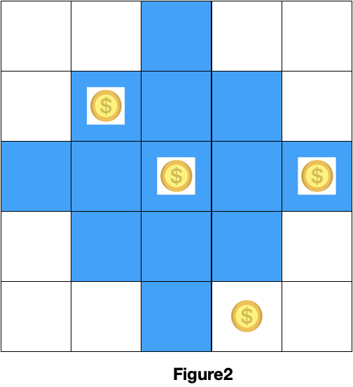 여기서 마름모 모양이란 특정 중심점을 기준으로 번 이내로 상하좌우의 인접한 곳으로 이동하는 걸 반복했을 때 갈 수 있는 모든 영역이 색칠되어 있는 모양을 의미합니다. [그림 ]은 가 일때의 마름모 모양이고, [그림 ]는 가 일때 마름모 모양입니다. 가 인 경우는 지점 한 곳에서만 채굴하는 것을 의미하며 이 역시 올바른 마름모 모양이라 할 수 있습니다. 올바르지 않은 마름모 모양을 이용해서는 채굴이 불가능합니다.