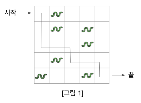 n * m 크기의 이차원 영역의 좌측 상단에서 출발하여 우측 하단까지 뱀에게 물리지 않고 탈출하려고 합니다. 이동을 할 때에는 반드시 아래와 오른쪽 2방향 중 인접한 칸으로만 이동할 수 있으며, 뱀이 있는 칸으로는 이동을 할 수 없습니다. 예를 들어 <그림 1>과 같이 뱀이 배치되어 있는 경우 실선과 같은 경로로 탈출을 할 수 있습니다. 이때 뱀에게 물리지 않고 탈출 가능한 경로가 있는지 여부를 판별하는 코드를 작성해보세요.