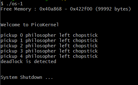 위의 코드에서는 모든 철학자가 왼쪽의 젓가락 1개만 들었고 2개의 젓가락을 확보할 수 없기 때문에 교착상태에 빠지게 되는 데드락의 예시로 볼 수 있다.