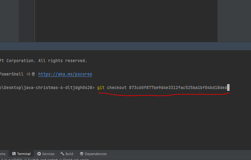 intelliJ로 넘어오셔서 아래와 git checkout {아까 복사한 해시값}을 터미널에 입력해줍니다.