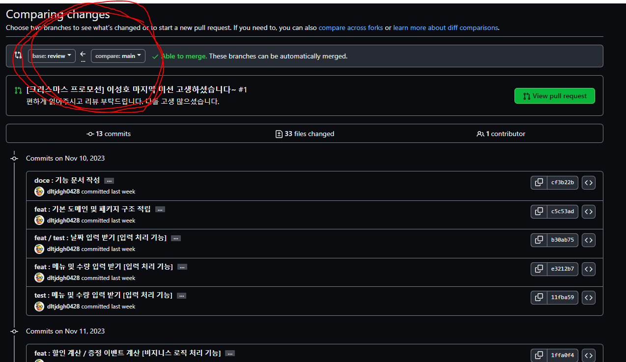 이후 git -> 생성한 래퍼지토리 -> pull request 창에 들어가서 review <- main 방향으로 PR을 날려주시면 됩니다.
