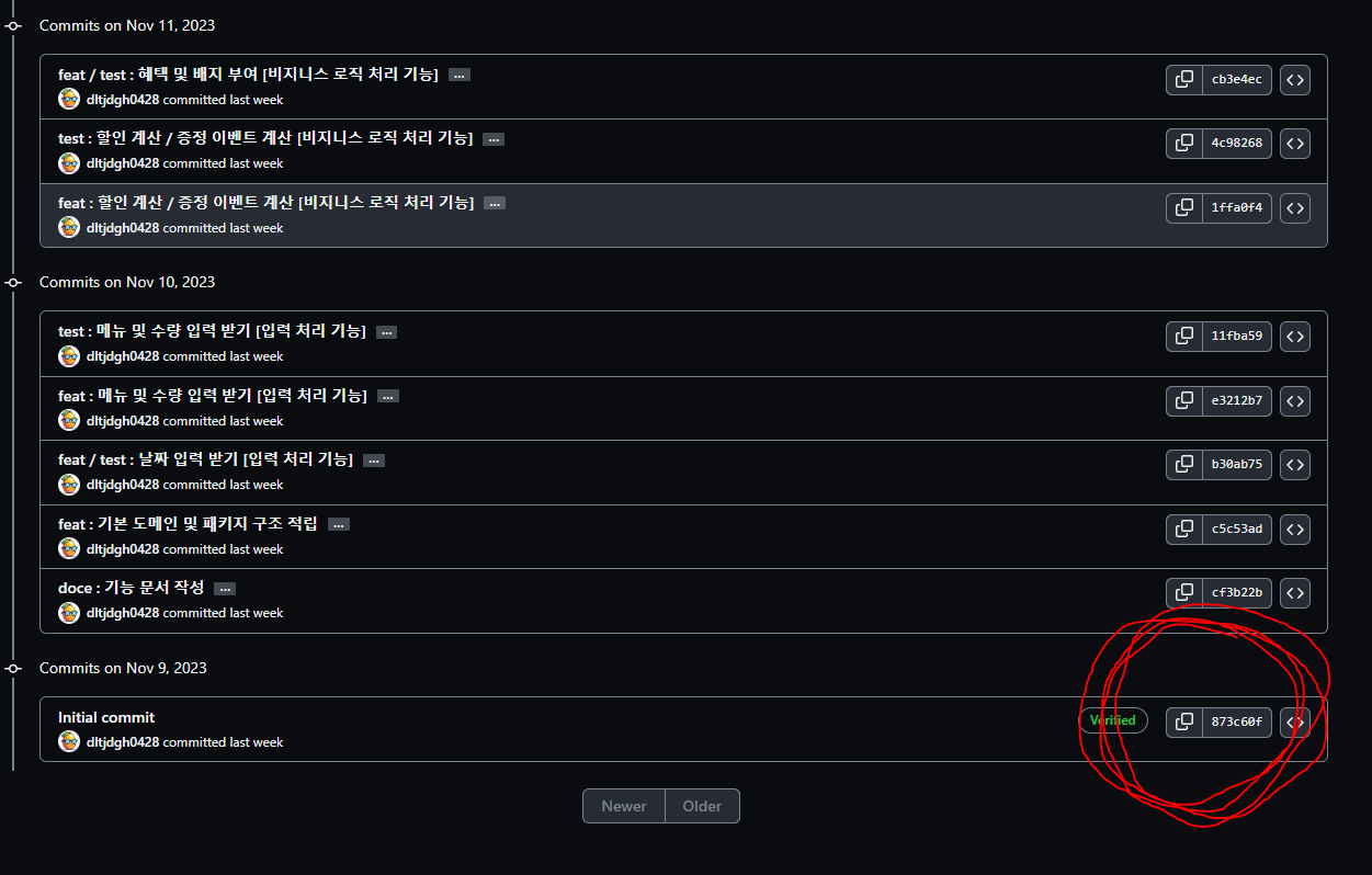 그이후 첫 커밋에 대한 해시값을 복사합니다.