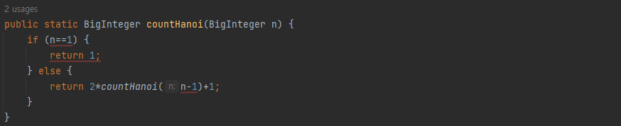 - 예시: countHanoi(n.subtract(BigInteger.ONE)).multiply(BigInteger.valueOf(2))는 n-1에 대한 하노이 탑의 이동 횟수를 계산한 후, 그 결과에 2를 곱합니다.
