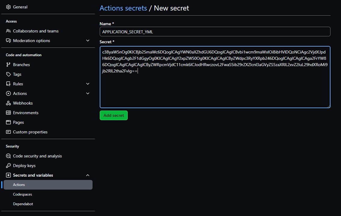 ✅ application-secret.yml 파일을 GitHub-Secrets에 등록하겠습니다.