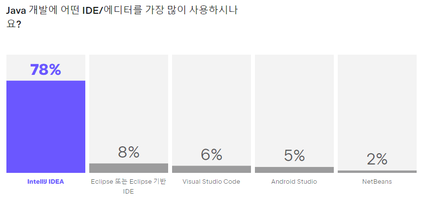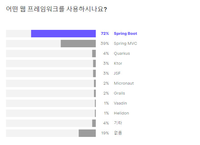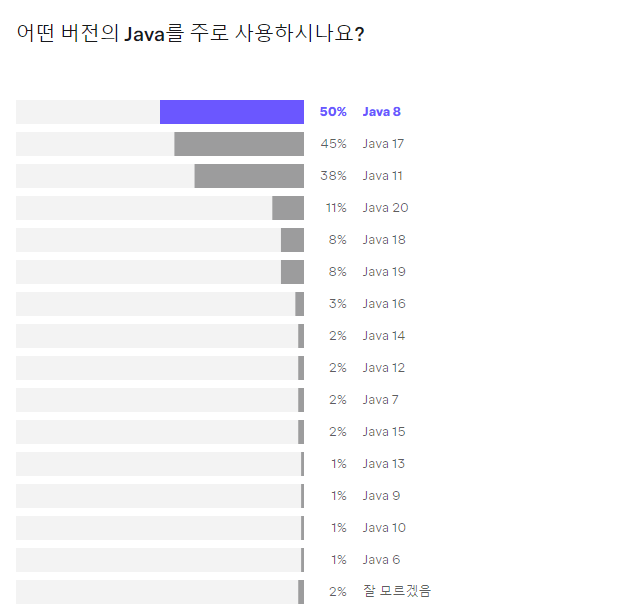 2023년 기준 자바 17이 드디어 자바 11 버전의 사용율을 이겼네요. 새롭게 등장한 SpringBoot 3 버전도 자바 17 이상만 지원하기 때문에 앞으로 새롭게 등장하는 웹서비스에 대해서는 Java17을 사용할 확률이 높겠습니다. 아마두?