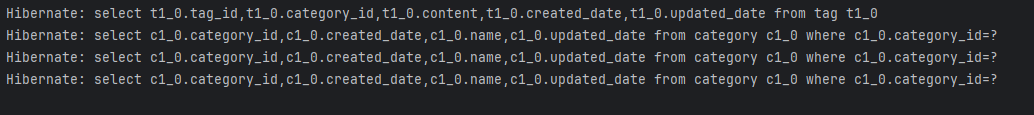 Hibernate: select t1_0.tag_id,c1_0.category_id,c1_0.created_date,c1_0.name,c1_0.updated_date,t1_0.content,t1_0.created_date,t1_0.updated_date